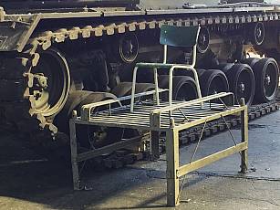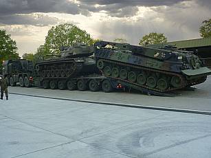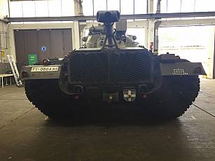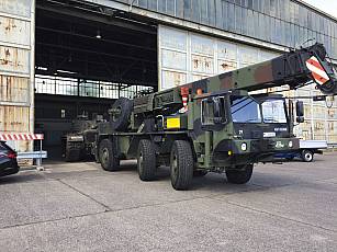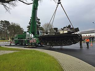 On April 29, 2021, almost a year after his arrival at the GFM-Rommel barracks in Augustdorf, he was pushed by a BĂĽffel armored recovery vehicle to his pedestal at the north gate, still with masking tape on the tower (film). From 09:30 a.m. it was lifted onto its final stand, its base, by a 100 t crane (image 28, image 29, image 30 and film).